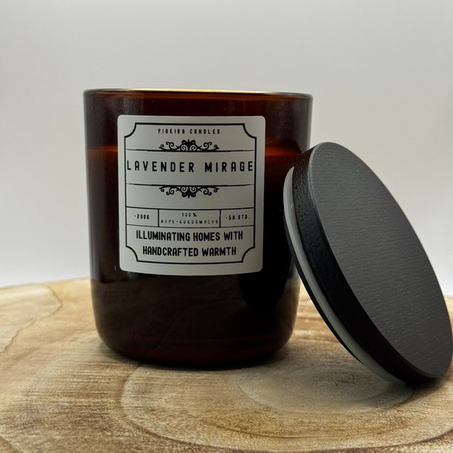 • Handgegossen in 300 ml Braunglas mit Holzdeckel